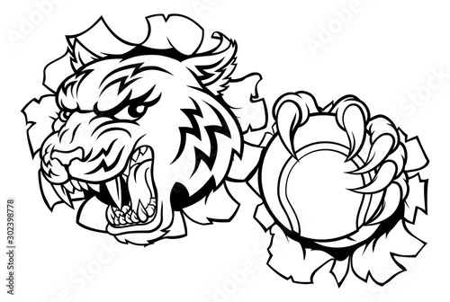 A tiger tennis player cartoon animal sports mascot holding a ball in its claw