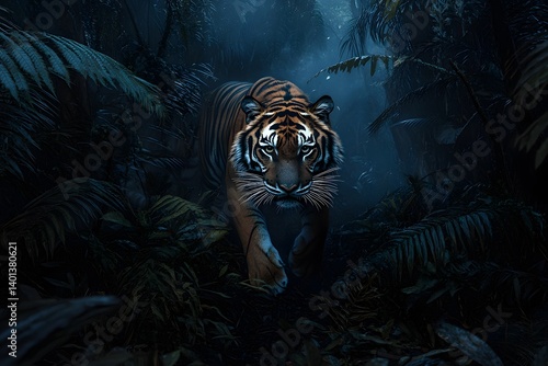 A tiger walking through a dark jungle with lush foliage and a mysterious, moody atmosphere pervading