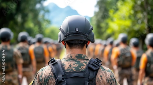 A tight formation of soldiers wearing tactical helmets and gear lineup in a straight row on a bright day, epitomizing military precision and discipline amidst nature.
