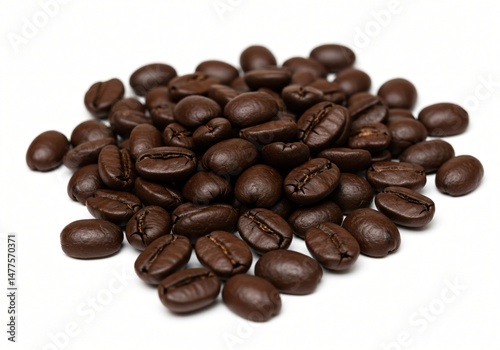 A tightly framed shot of a small pile of dark roasted coffee beans scattered on a stark white background.