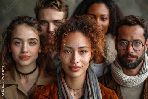 A tightly knit group of friends are closely together with focus on a woman in orange