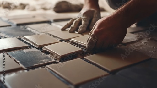 A tile installer laying ceramic tiles in a bathroom. Featuring detail and precision