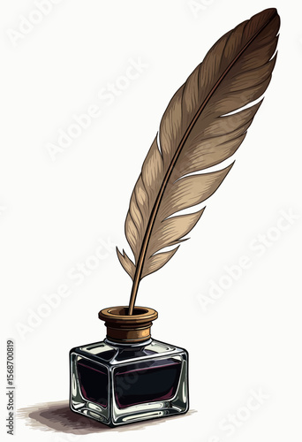 A timeless illustration of a classic brown feather quill pen in a glass inkwell, symbolizing the art of literature, historical writing, and calligraphy.