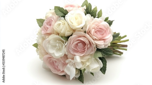 A timeless pink and white rose bouquet, thoughtfully arranged with green foliage and wrapped with an elegant silk ribbon.