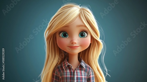 A timeless touch of style Little cute 3D cartoon child with long blond hair on a sunny day Adorable small 3D cartoon girl wearing a plaid shirt in fun street fashion Her look is stylish with a col