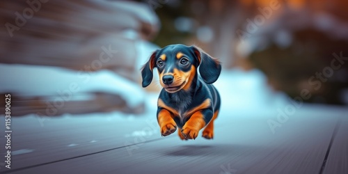A tiny Dachshund puppy plays happily, running elegantly along a snow-covered path as the soft glow of the setting sun illuminates the surroundings