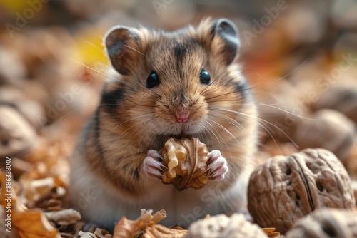 A tiny hamster holding a walnut in its paws, sitting on a soft bed of wood shavings. The hamster's cheeks are puffed up with food
