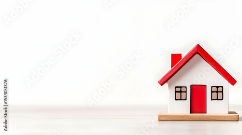 A tiny house model for a real estate concept on a wooden table with white copy space