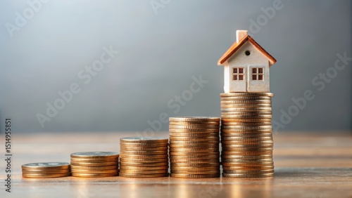 A tiny house with a small stack of coins under it, money stack, riches, money stack, riches