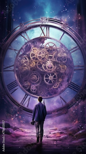 A tiny man stands near a violet, lilac, magical, mysterious large clock. past and future. concept of wasting time.