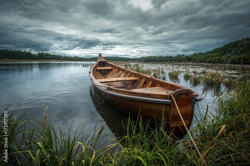 A tiny wooden boat tied up by a pond in gentle rainfall.