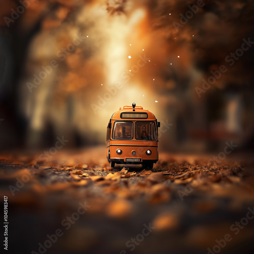 A tiny yellow tram moves through a maple forest in the fall.