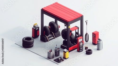 A tire service station with equipment for tire maintenance and storage.