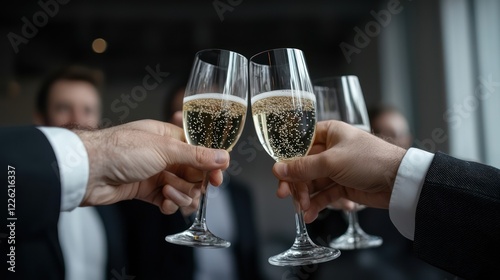 A toast with champagne glasses raised in celebration among a group of people.