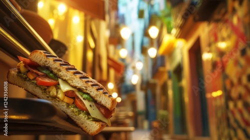 A toasted panini sandwich with melted cheese, basil pesto, and roasted vegetables, with balsamic glaze accents