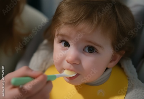 A toddler enjoys a meal being fed with a green spoon in a cozy setting.