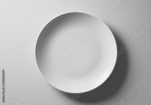 A top down view of a plain white ceramic plate on a white surface with subtle shadows around it