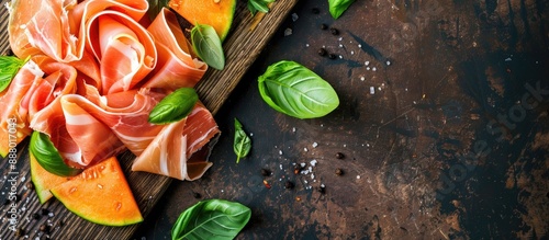 A top down view of an Italian appetizer prosciutto ham paired with cantaloupe and basil on a wooden board against a rustic dark backdrop with space for text and imagery. Copy space image