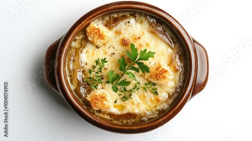 A top view of a classic French onion soup in a rustic bowl, showcasing bubbling cheese and crispy croutons, beautifully isolated against a clean white background.