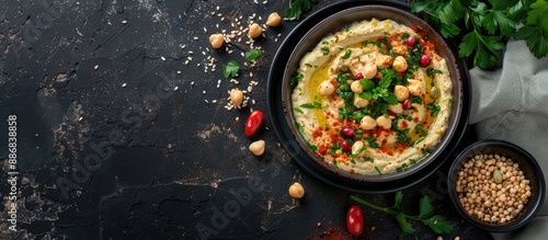 A top view of a classic hummus dish displayed with a blank area for additional image or text, known as a copy space image.