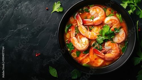 A top view of steaming tom yum kung in a black bowl, showcasing succulent shrimp, vibrant herbs, and spices, beautifully set against a dark stone background with clear copy space. -