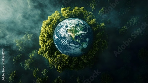 A top view of the Earth surrounded by dense green forests symbolizing hope and environmental protection.
