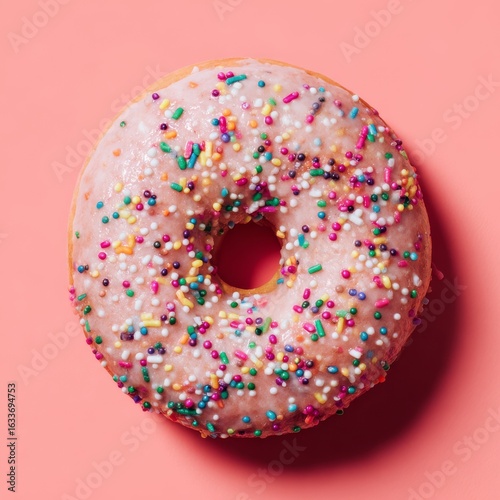 A top-down shot of a delicious donut with icing and colorful sprinkles, a sweet treat set against a pastel background.