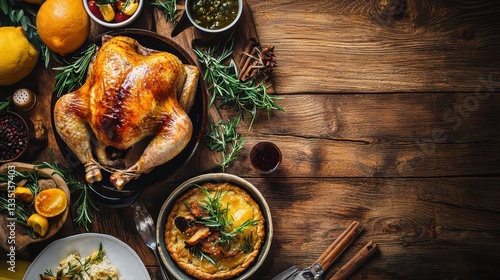 A top-down view of a delectable golden roast, nestled amid an array of meticulously arranged side dishes and garnishes.