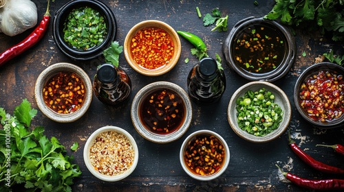 A top-down view of a table filled with chili sauce bottles, soy sauce, and fish sauce, arranged neatly with bowls of fresh chopped chilies on the side.