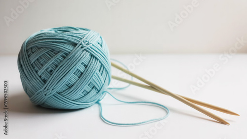 A top-down view of a turquoise-colored ball of knitting yarn with a loose strand trailing off to the right, resting on a pair of beige wooden knitting needles.