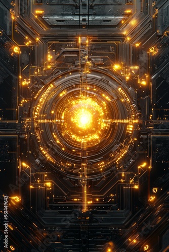 A top-down view of an advanced energy core, glowing with golden light and surrounded by intricate circuitry