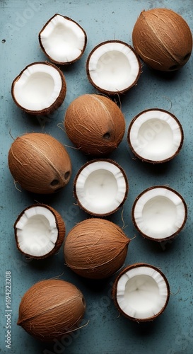 A top-down view of several halved coconuts arranged on a muted teal surface, showcasing the contrasting textures and colors of the husk and the white flesh inside.