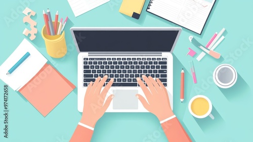 A top-view of a person typing on a laptop with stationery and coffee on a vibrant workspace, ideal for productivity themes.