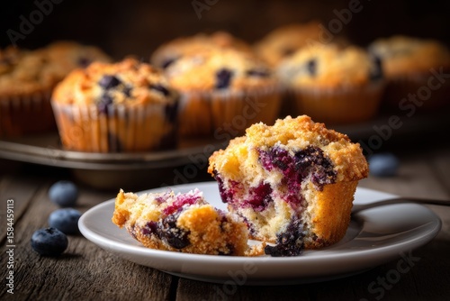 A torn blueberry muffin rests on a white plate atop a dark wood table with a tray of muffins behind it