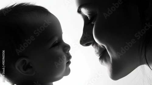 A touching scene of mother and child bonding, their faces radiating pure love and connection, set against a minimalist white background with soft Gaussian blur.