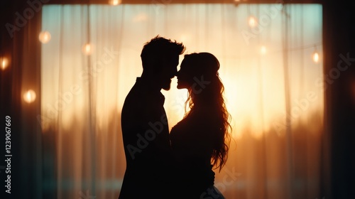 A touching silhouette of a couple facing each other against a beautiful sunset backdrop, capturing the essence of romance and the connection between two people.