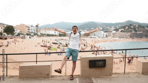 A tourist with a backpack is insanely happy to be on the beach. Vacation start