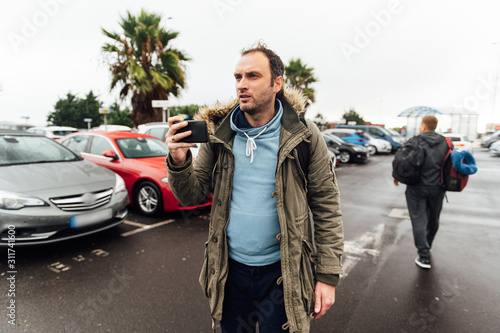 A tourist with a heavy backpack in the parking lot is looking for a car rental company