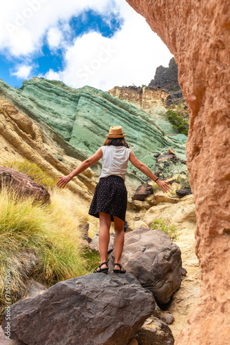 A tourist woman with a hat and open arms at the Azulejos de Veneguera or Rainbow Rocks in Mogan, Gran Canaria