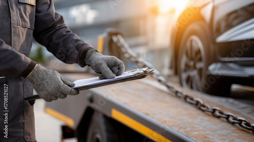 A tow truck driver their gloves thick loads a vehicle onto a flatbed its metal rusted. The vehicle’s bumper its surface crumpled tilts on the ramp. A chain its links heavy