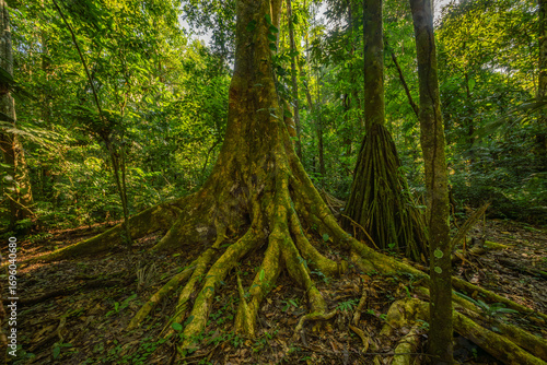 A towering kapok tree in the Amazon rainforest, surrounded by dense greenery and smaller plant species