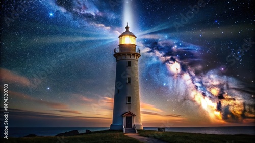A towering lighthouse stands solitary against a starry night sky, its beam of light piercing through darkness with majestic grandeur, darkness, solitude