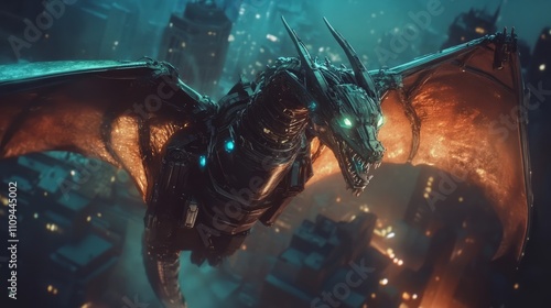 A towering, mechanical dragon with glowing eyes and metallic wings, perched on a futuristic skyscraper