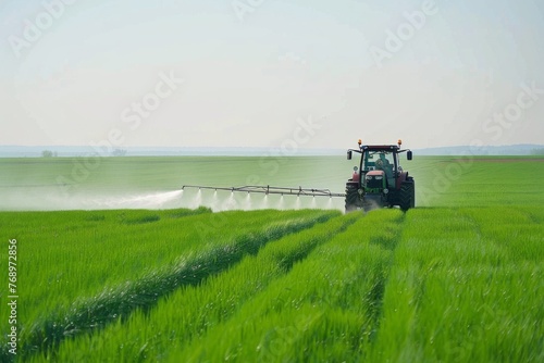 A tractor is fertilizing plants on a green field under a clear sky