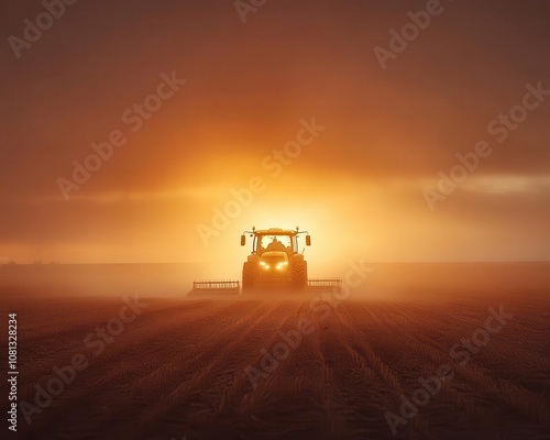 A tractor plowing a large field at sunrise, Agricultural Machinery, Powerful and productive
