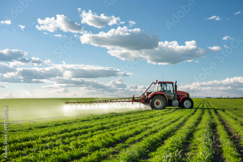 A tractor sprays a field of green crops on a sunny day. The tractor is driving across the field