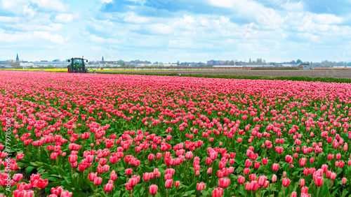 A tractor tilling a field of tulips in the Netherlands. Tractor removes tulips on the field. A field of tulips in close-up. Pink tulips grow in a flower field on a family farm in Lisse.