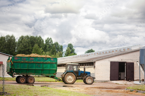 A tractor with a trailer is carrying hay for cattle.