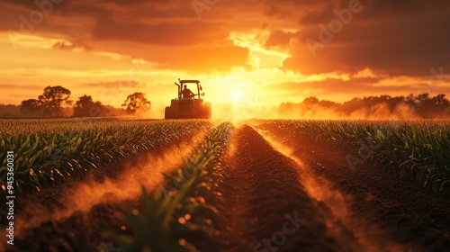 A tractor works the fields at sunset, casting a warm glow over rows of crops, evoking the beauty of farm life and nature.