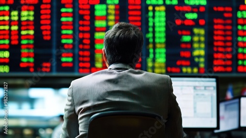 A trader monitors stock market data on screens displaying fluctuating prices and trends.